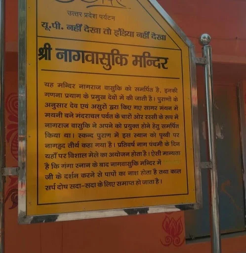 पद्म पुराण के पाताल खंड व श्रीमद्भागवत में नाग वासुकी व इस मंदिर का विस्तृत उल्लेख मिलता है। कथा के अनुसार, समुद्र मंथन में देवताओं व असुरों ने नागवासुकी को सुमेरु पर्वत में लपेटकर उनका प्रयोग रस्सा के तौर पर किया गया था। मंथन के चलते नागवासुकी के शरीर में काफी रगड़ हुई थी और जब मंथन समाप्त हुआ तो उनके शरीर में जलन होने लगी थी। और उस जलन को दूर करने के लिए वासुकी जी मंद्राचल पर्वत चले गए, लेकिन उनके शरीर की जलन खत्म नहीं हुई। तब नाग वासुकी ने भगवान विष्णु से अपनी पीड़ा कही और जलन खत्म करने का उपाय पूछा। भगवान विष्णु ने नागवासुकी को बताया कि वह प्रयाग चले जाएं वहां सरस्वती नदी का अमृत जल का पान करें और वही विश्राम करें, जिससे उनकी सारी पीड़ा समाप्त जाएगी।